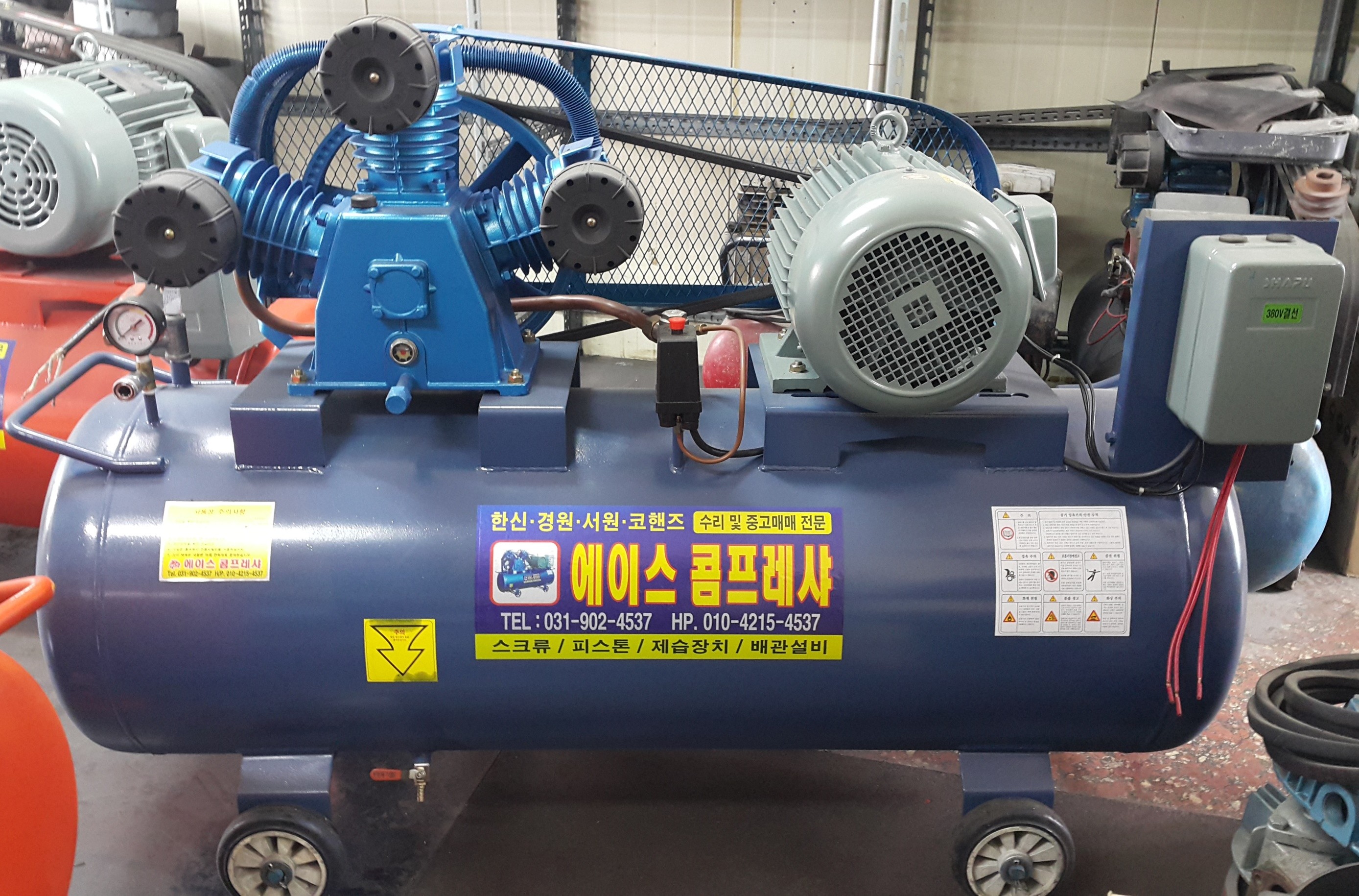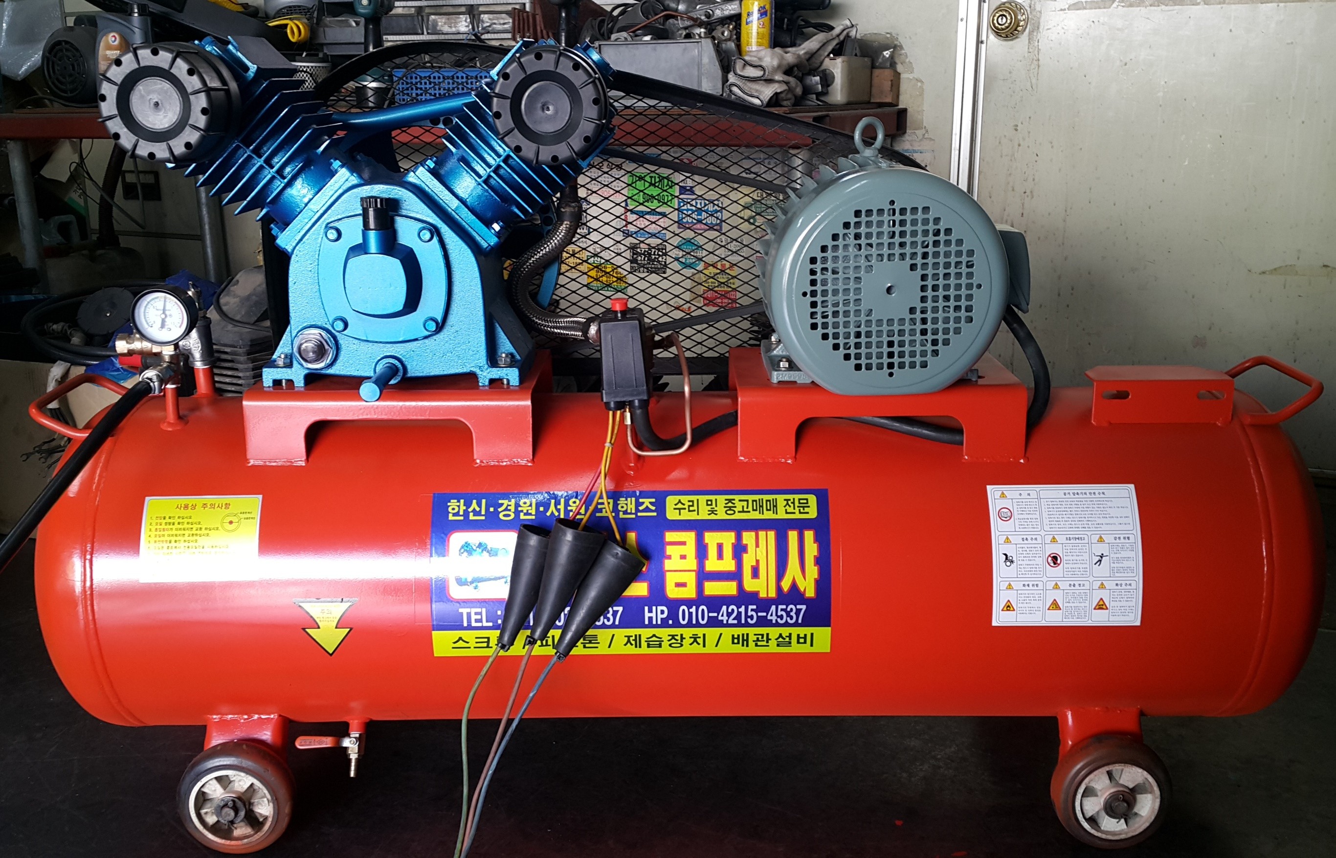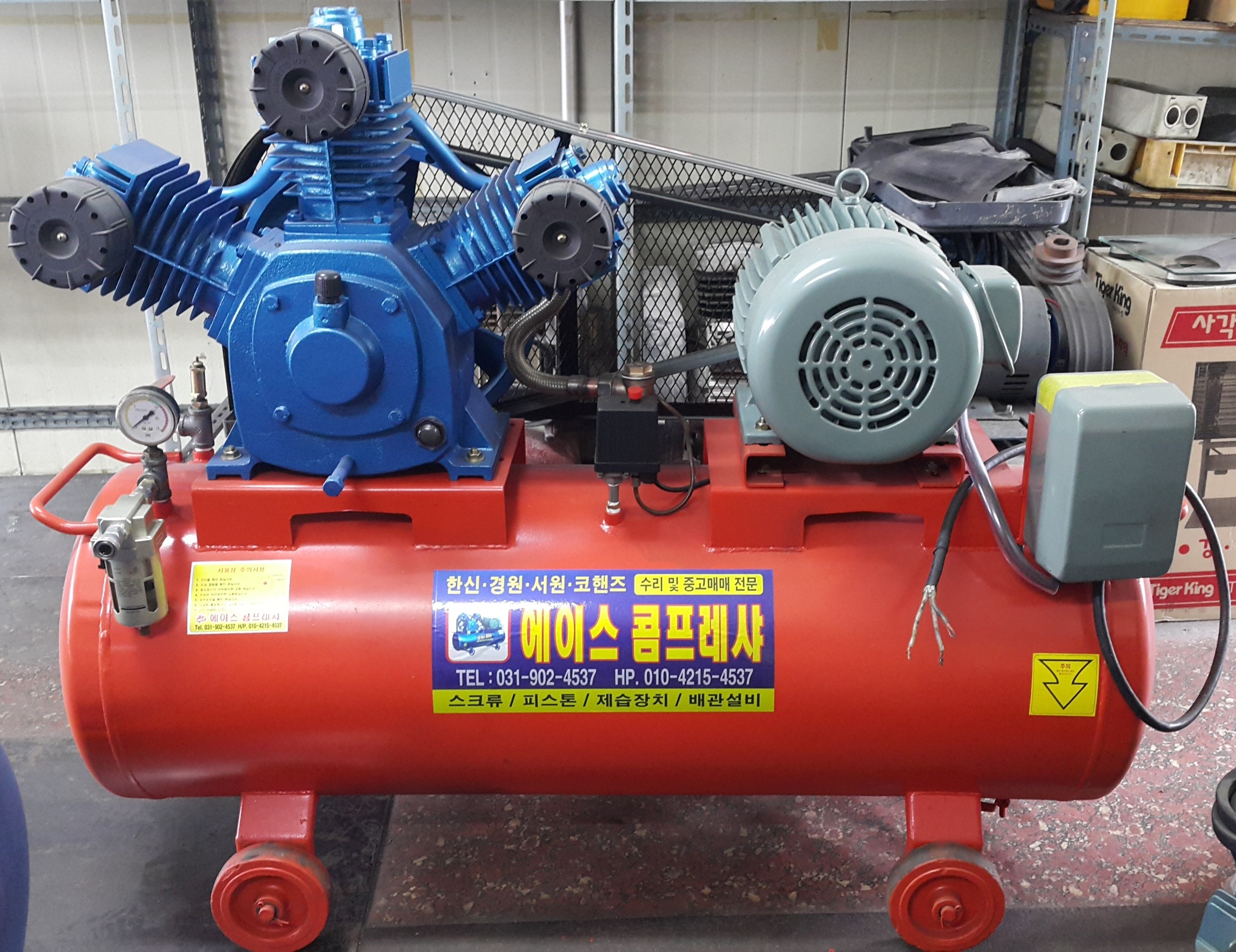 중고콤프레샤 산업용 3마력입니다. 모터는 새제품이고 사용전기는 일반 220V, 탱크역시 새제품이고 용량은 120리터입니다. 콤프레샤 헤드만 올 수리 올보링한 후 부식방지를 위한 도색까…