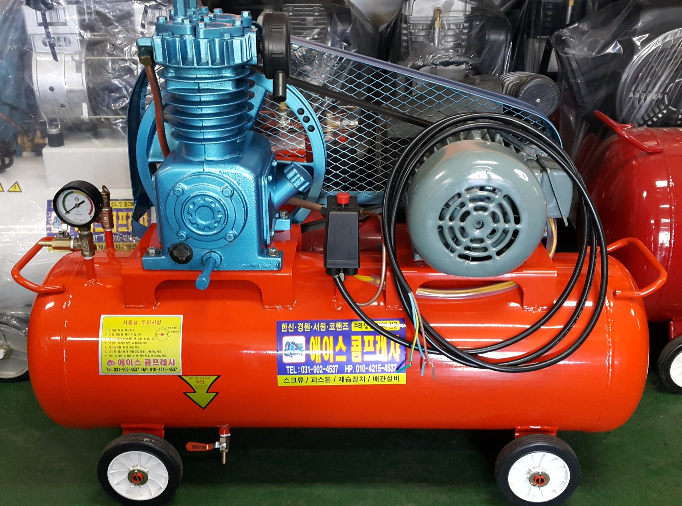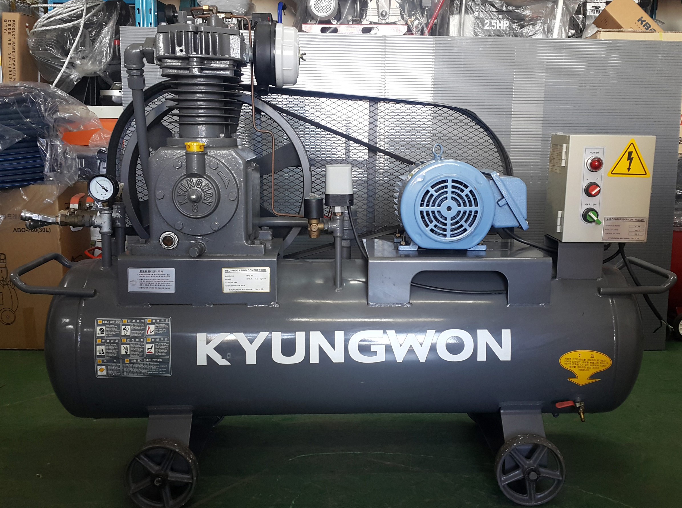 중고콤프레샤 산업용 5마력입니다. 콤프레샤계의 명품콤프레샤 경원콤프레샤 제품입니다. 탱크용량은 150리터, 사용전기는 삼상 380V입니다. 중고처럼 보이시나요? 험하게 사용하…