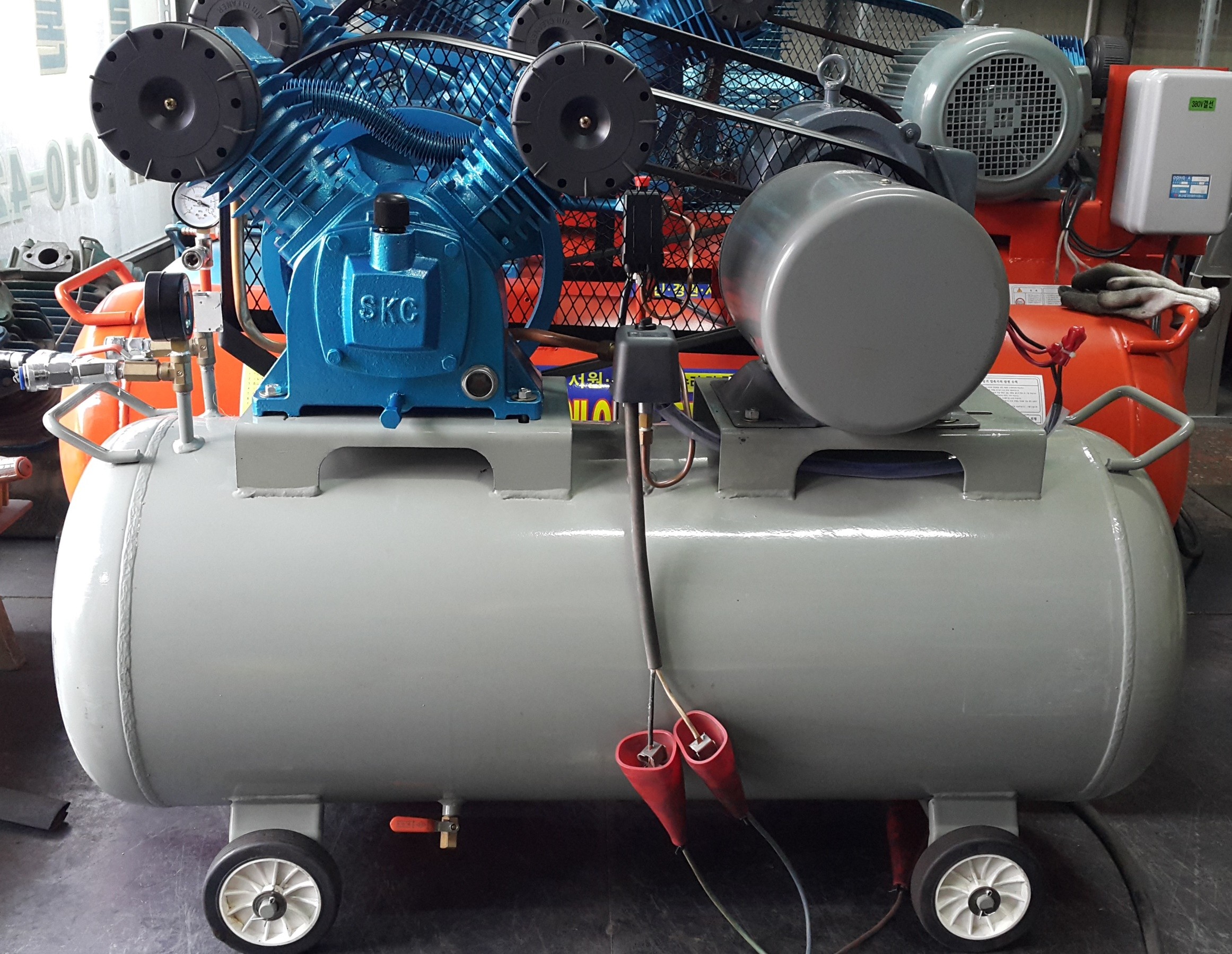 중고콤프레샤 산업용 10마력입니다.(우리산업기계 제품) 사용전기는 삼상 380V, 탱크용량은 400리터(20마력용)입니다. 올 수리 올보링한 후 부식방지를 위한 도색까지 깔끔하게 마무리했습니다. …